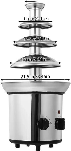 Elegáns 4-szintes csokoládé szökőkút - Tökéletes partikra és rendezvényekre! ?? Varázsolj felejthetetlen élményt vendégeidnek ezzel a stílusos csokoládé szökőkúttal! Ideális választás partikra, esküvőkre, családi összejövetelekre, vagy bármilyen különleges alkalomra. A szökőkút nem csak finom, de látványos központi eleme is lesz az eseménynek. Főbb előnyök:Könnyű használat: Egyszerűen beüzemelhető és kezelhető, így bárki élvezheti a csokoládé szökőkút nyújtotta élményt. Kényelmes tisztítás: A szétszedhető alkatrészeknek köszönhetően a tisztítás gyors és egyszerű. Elegáns design: A rozsdamentes acél külső modern és vonzó megjelenést kölcsönöz. Biztonságos működés: A túlmelegedés elleni védelem garantálja a biztonságos használatot. Műszaki adatok:Jellemző ÉrtékAnyag Rozsdamentes acélŰrtartalom 1.8 literSzintek száma 4Fűtési hőmérséklet 40°CTeljesítmény 170WBiztonság Túlmelegedés elleni védelemTökéletes választás:Partikra és rendezvényekre: Lenyűgöző látványosság és finom desszert egyben. Édesszájúaknak: Különleges élmény a csokoládé szerelmeseinek. Ajándéknak: Egyedi és emlékezetes ajándékötlet. Élvezd a csokoládé szökőkút nyújtotta örömöket, és tedd felejthetetlenné a különleges pillanatokat! ✨